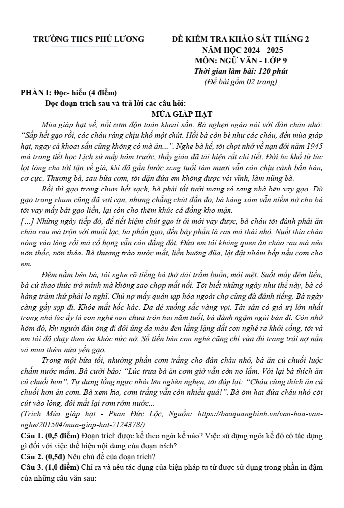 Đề thi thử Văn vào lớp 10 năm 2025 trường THCS Phú Lương