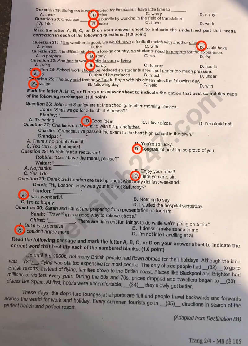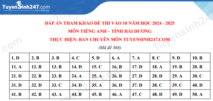 Đáp án Đề thi vào 10 môn Tiếng Anh Hải Dương năm 2024 tham khảo
