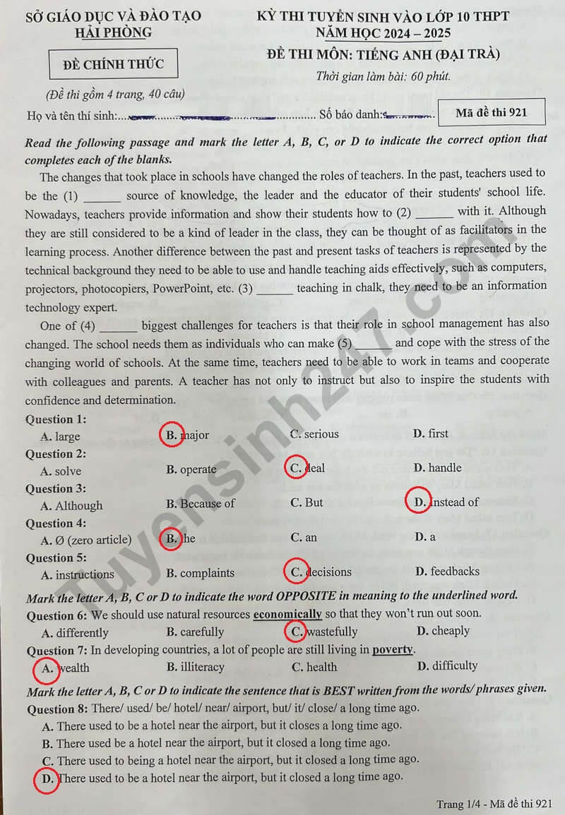 Đề thi tuyển sinh vào lớp 10 Tiếng Anh Hải Phòng năm 2024 (chính thức)
