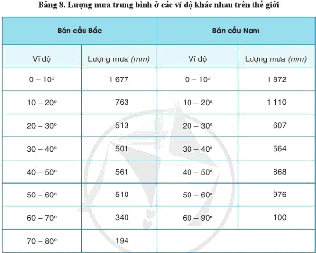 Câu hỏi trang 34 Địa Lí 10: Dựa vào bảng 8, hãy trình bày sự phân bố lượng mưa ở các khu vực xích đạo, chí tuyến, ôn đới và cực.