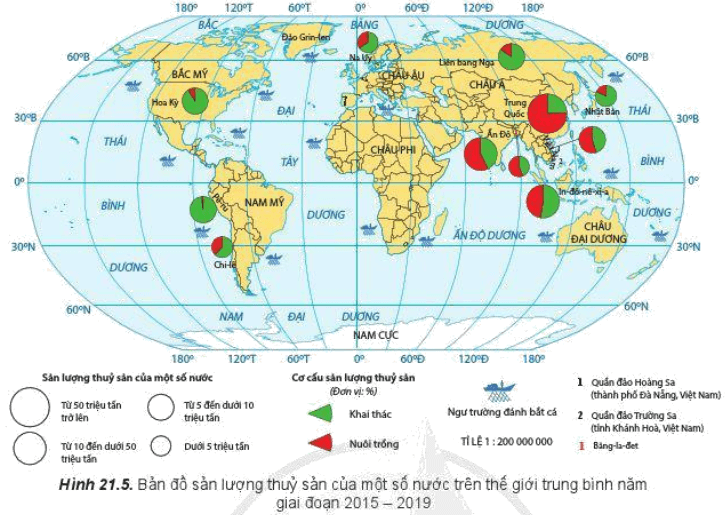 - Quốc gia có sản lượng thuỷ sản từ 5 triệu tấn đến dưới 10 triệu tấn: Việt Nam, Liên bang Nga, Hoa Kỳ, Pê-ru.
