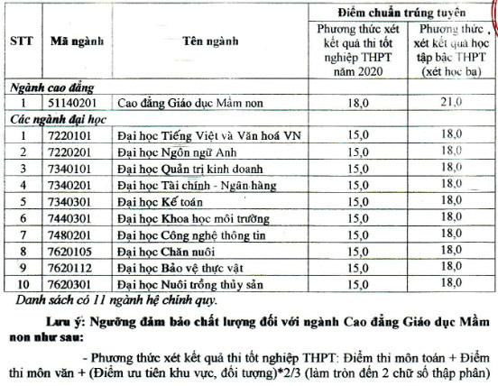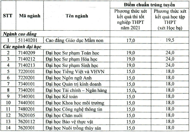 Cụ thể, 10 ngành đào tạo Đại học (cùng 14 điểm): Công nghệ thông tin, Tiếng Việt và văn hóa Việt Nam, Ngôn ngữ Anh, Quản trị kinh doanh, Kế toán, Tài chính - Ngân hàng, Nuôi trồng thủy sản, Chăn nuôi, Bảo vệ thực vật, Khoa học môi trường.