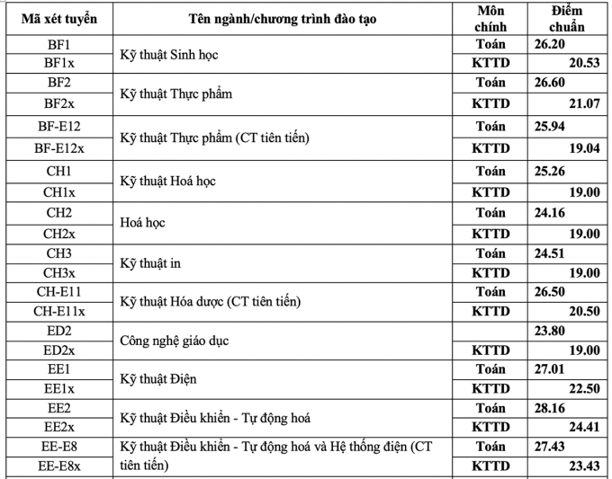 | KT24 | Điện - Điều khiển và Tự động hóa | 27.25 | Tiêu chí phụ 1: 26.85; Tiêu chí phụ 2: NV1 |