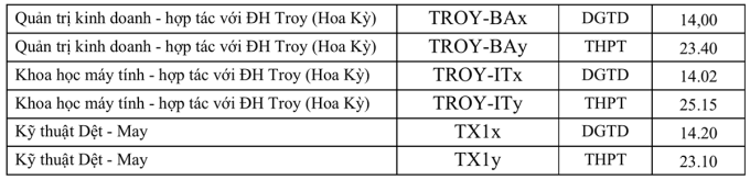 Ngành Khoa học máy tính (IT1) lấy điểm đầu vào cao nhất, nhưng thấp hơn năm ngoái 0,61. Ngành Quản trị kinh doanh chương trình liên kết với Đại học Troy (Mỹ) lấy thấp nhất - 23,25 điểm, cao hơn năm ngoái 0,75.