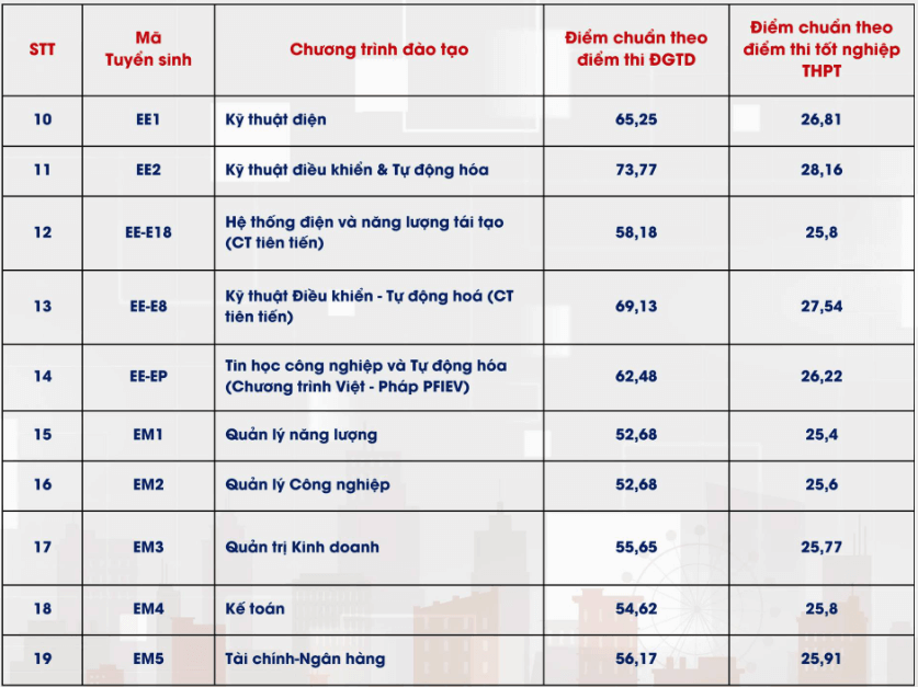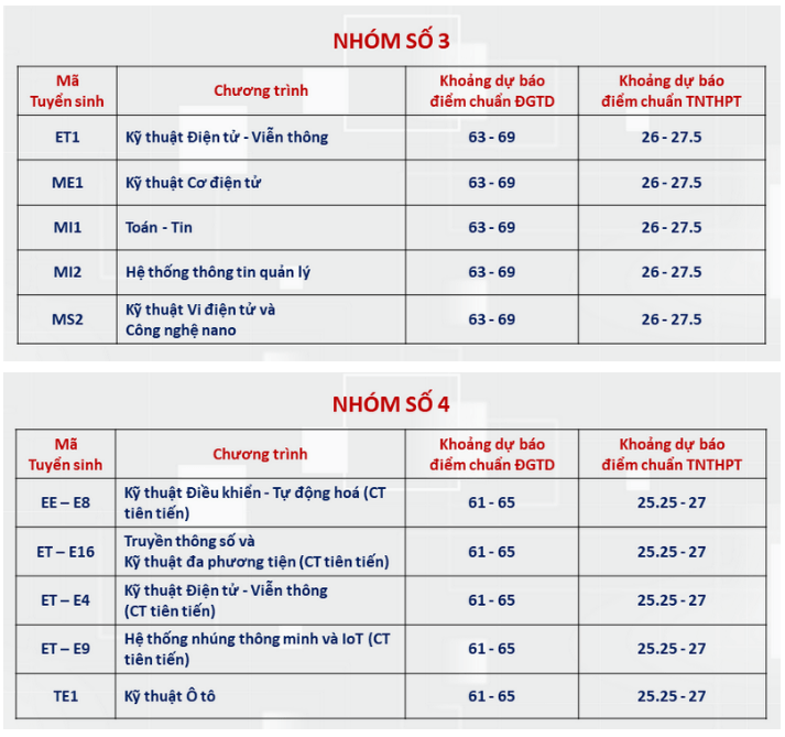 | TT21 | Điện tử - Viễn thông | 25.5 | Tiêu chí phụ 1: 24.6; Tiêu chí phụ 2: NV1-NV2 |