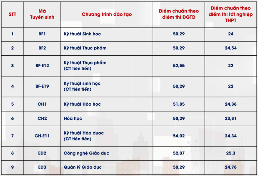 | KT31 | Hóa - Sinh - Thực phẩm và Môi trường | 25 | Tiêu chí phụ 1: 23.65; Tiêu chí phụ 2: NV1-NV5 |