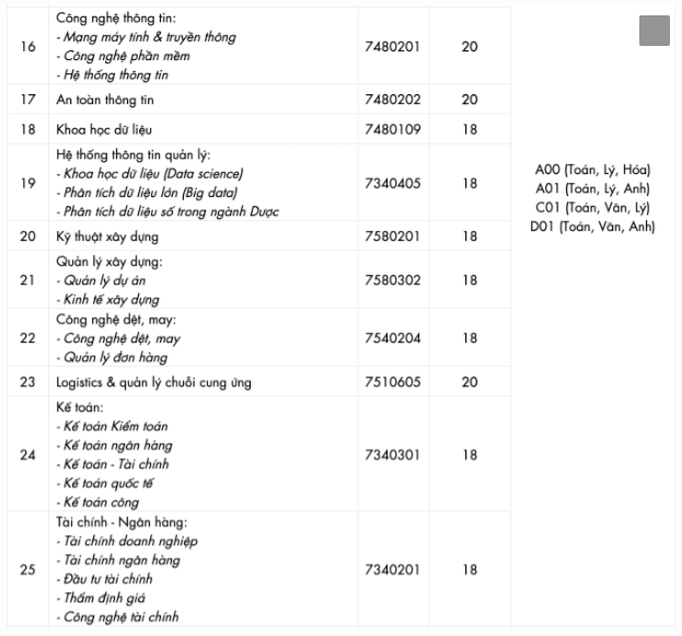| 52480201 | Công nghệ thông tin | A00; A01; C01; D01 | 19 |