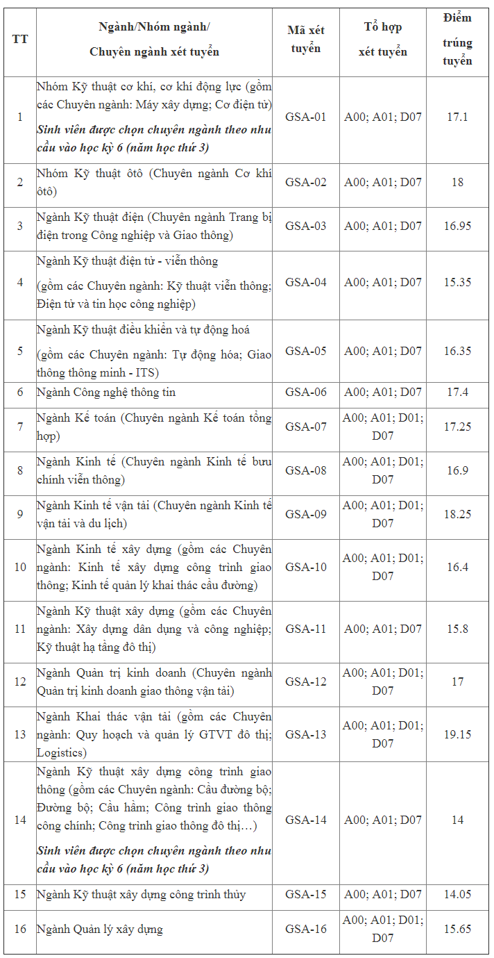 Điểm chuẩn Đại học Giao thông Vận tải - Cơ sở 2 ở phía Nam năm 2017