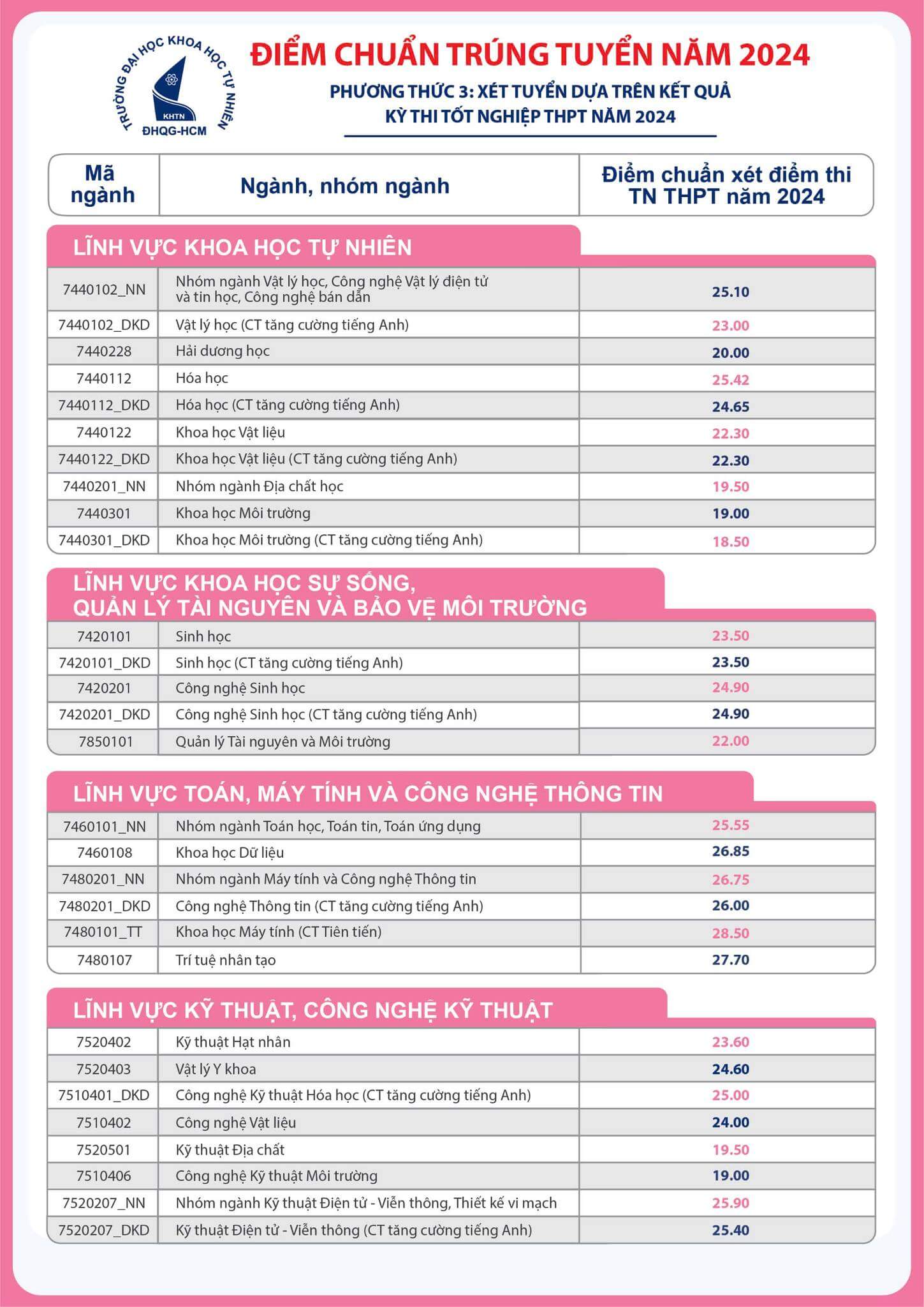 - Trường Đại học Khoa học Tự nhiên - Đại học Quốc gia TP.HCM, công bố điểm chuẩn phương thức xét tuyển dựa trên kết quả thi tốt nghiệp THPT năm 2024.
