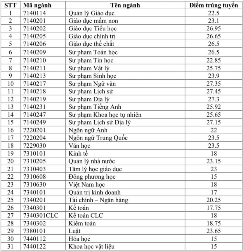 Điểm trúng tuyển dao động từ 15-25,75 điểm, trong đó có 26 ngành lấy 15 điểm; điểm trúng tuyển cao thuộc khối các ngành sư phạm.