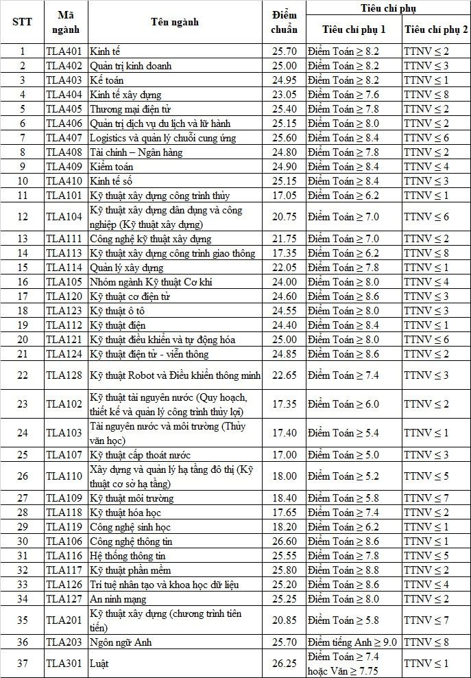 Trường Đại học Thủy lợi thông báo ngưỡng đảm bảo chất lượng đầu vào Đại học chính quy năm 2025 tại Hà Nội (TLA) như sau:
