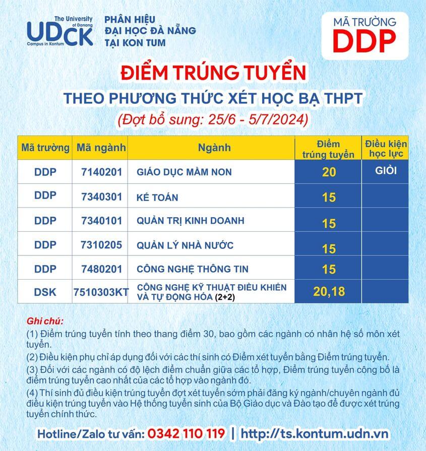 Điểm trúng tuyển phương thức xét kết quả học tập cấp trung học phổ thông năm 2024 vào Phân hiệu Đại học Đà Nẵng tại Kon Tum, xét tuyển sớm – đợt bổ sung từ ngày 25/6/2024 đến ngày 05/7/2024 như sau: