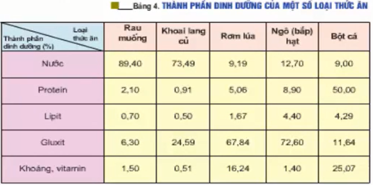 (trang 101 sgk Công nghệ 7): Em hãy nhận xét nguồn gốc của mỗi loại thức ăn trong bảng .