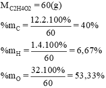 Bài 4: (trang 108 sgk Hóa 9 - Video giải tại 9:10) Axetic có công thức C2H4O2. Hãy tính thành phần phần trăm khối lượng của các nguyên tố trong axit axetic.
