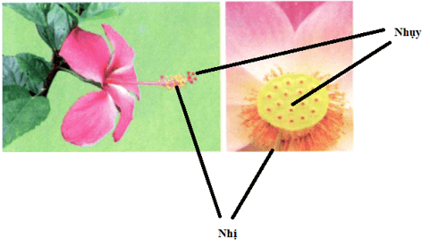 - Hãy chỉ vào nhị (nhị đực) và nhụy (nhị cái) của hoa râm bụt và hoa sen.