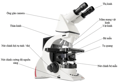 - Thân kính: ống kính (thị kính, đĩa quay gắn với vật kính, vật kính), ốc điều chỉnh (ốc to, ốc nhỏ).