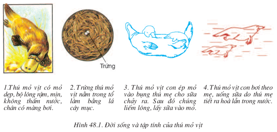 | Thú mỏ vịt | Nước ngọt | Chi có màng bơi | Đi trên cạn, bơi trong nước | Đẻ trứng | Bình thường | Chưa có vú, chỉ có tuyến sữa | Liếm sữa bám trên lông mẹ hoặc uống sữa hòa tan trong nước |
