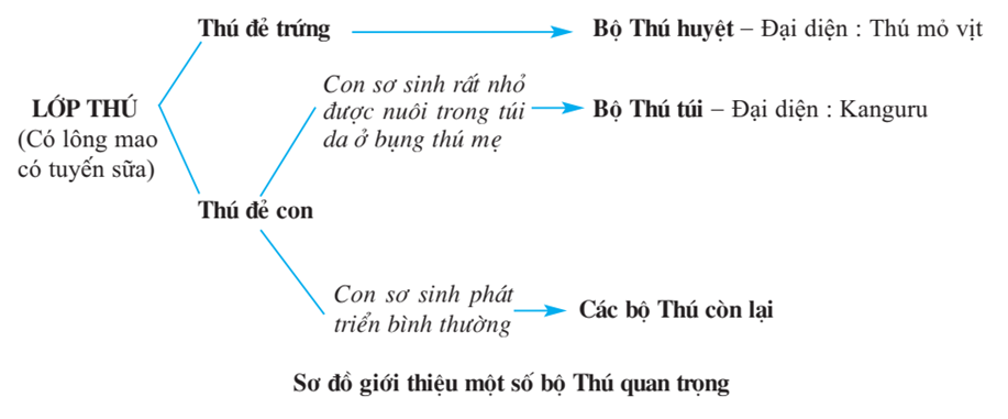 Lớp Thú hiện nay có khoảng 4 600 loài, 26 bộ. Ở Việt Nam đã phát hiện được 275 loài. Các loài thú đều có lông mao và tuyến sữa. Sơ đồ sau đây giới thiệu một số bộ Thú quan trọng.