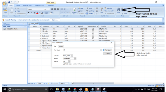 Sau đó Access sẽ lần lượt nhảy đến các bản ghi có giá trị một môn nào đó là 10.0