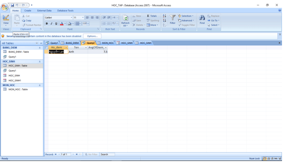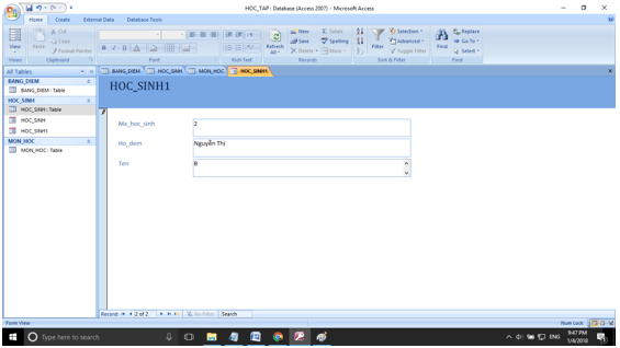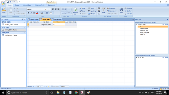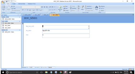 - Giả sử ta nhập liệu cho bảng HOC_SINH bằng cách thông thường. Click đúp vào bảng HOC_SINH sẽ được giao diện như hình: