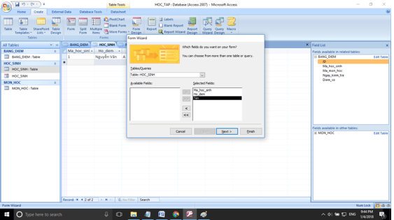 - Chọn bảng HOC_SINH, BANG_DIEM, MON_HOC.