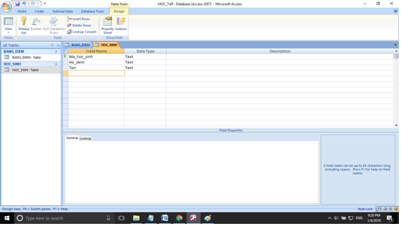 b) Tạo các bảng dữ liệu trong CSDL HOC_TAP với cấu trúc được mô tả trong bảng sau, đặt khóa chính cho mỗi bảng, mô tả tính chất cho các trường của mỗi bảng.