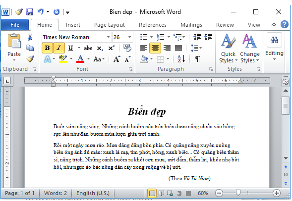 1) Khởi động Word và mở tệp Bien dep đã lưu trong bài thực hành trước.
