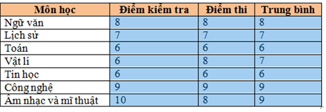 - Bước 4: Hoàn thành bảng: Nhập thêm các môn còn lại,ta được bảng: