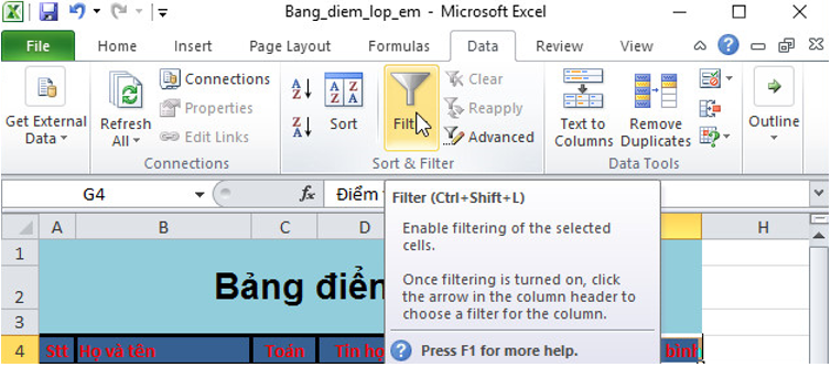 - Bước 1: Nháy chuột chọn một ô trong cột G (Điểm tổng kết), ví dụ chọn ô G4, chọn lệnhtrong nhóm Sort & Filter của dải lệnh Data để sắp xếp giảm dần theo điểm trung bình: