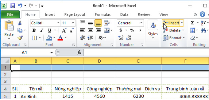 - Bước 1: Nháy chuột vào hàng 1, chọn lệnh Insert 3 lần trong nhóm Cells trên dải lệnh Home để tạo thêm 3 hàng:
