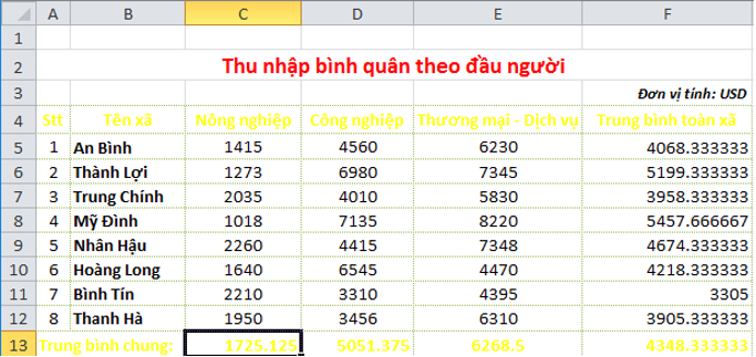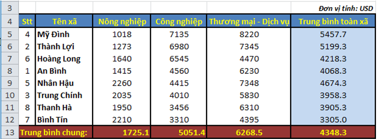 1. Thu nhập trung bình theo đầu người toàn xã của từng xã ghi vào các ô tương ứng trong cột Trung bình toàn xã: