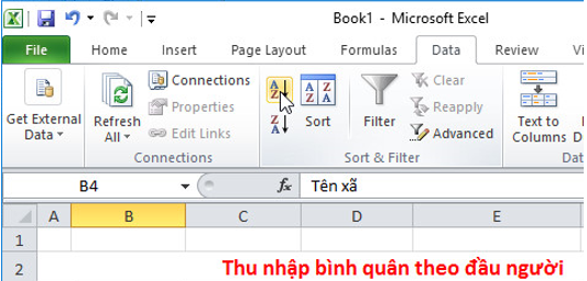 Nháy chuột chọn một ô trong cột B (Tên xã), ví dụ chọn ô B4, chọn lệnhtrong nhóm Sort & Filter của dải lệnh Data để sắp xếp theo thứ tự bảng chữ cái: