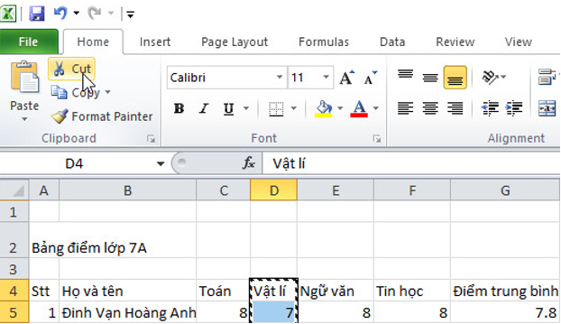 1. Di chuyển dữ liệu trong cột D (Vật lí) tạm thời sang một cột khác và xóa cột D: