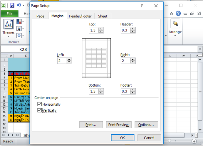 Trên trang Margins của hộp thoại Page Setup có hai lựa chọn khác ở phần dưới trang. Đánh dấu các ô này có tác dụng căn giữa nội dung trên trang in: