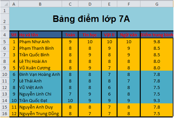1. Mở bảng tính Bang_diem_lop_em đã được lưu trong Bài thực hành 7.