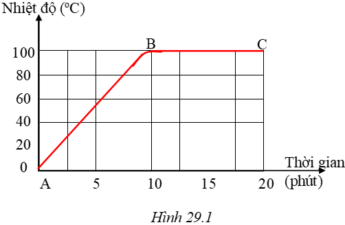 Bài C9 (trang 88 SGK Vật Lý 6): Hình 29.1 vẽ đường biểu diễn sự thay đổi nhiệt độ của nước khi được đun nóng. Các đoạn AB và BC của đường biểu diễn ứng với những quá trình nào?