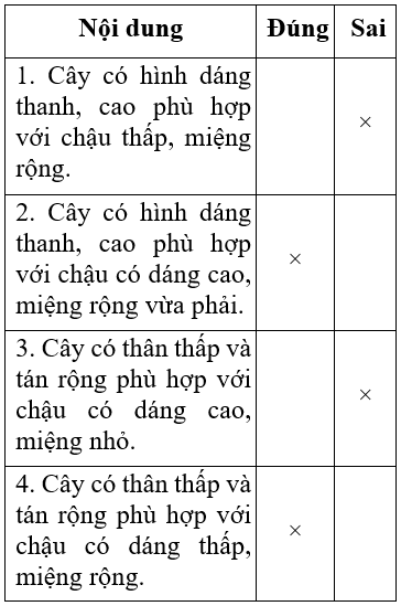 1 (Trang 87 Công nghệ 6 VNEN). Đánh dấu vào cột đúng/ sai tương ứng nội dung các câu trong bảng sau