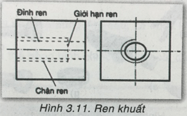 Câu 1 (trang 19 Công Nghệ 8 VNEN tập 1): Quan sát hình 3.11 và cho biết trường hợp ren trục hoặc ren lỗ bị che khuất thì các đường đỉnh ren, chân ren, giới hạn ren được vẽ bằng nét gì?