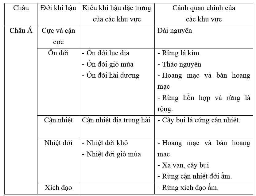 Bài 2 trang 73 Địa Lí 8: Dựa vào hình 20.1 và kiến thức đã học, điền vào bảng theo mẫu dưới đây một số đặc điểm tiêu biểu của khí hậu, cảnh quan tự nhiên của châu Á.