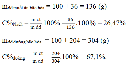 Bài 7: Ở nhiệt độ 25oC độ tan của muối ăn là 36g của đường là 204g. Hãy tính nồng đồ phần trăm của các dung dịch bão hòa muối ăn và đường ở nhiệt độ trên.