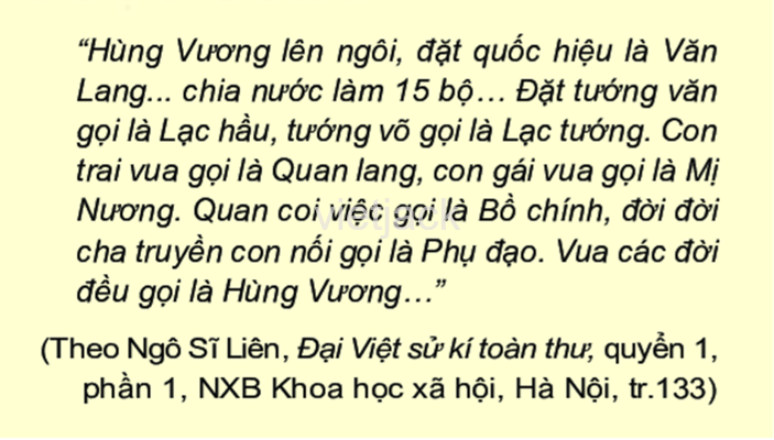 + Thông tin sơ lược về tổ chức hành chính thời Văn Lang: “cả nước chia là 15 bộ”