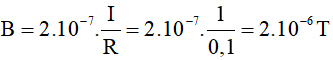Cảm ứng từ gây ra bởi dòng điện thẳng cường độ I = 1A tại một điểm cách dòng điện một khoảng R = 10 cm là: