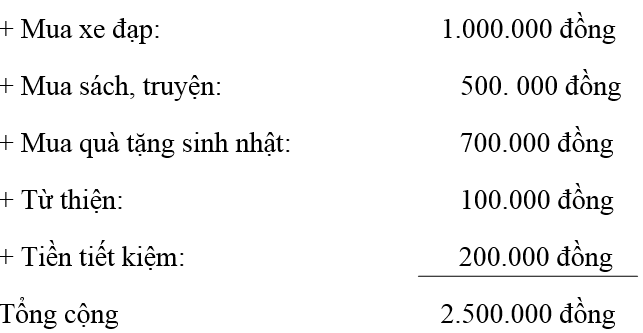 - Mỗi năm em có các nguồn thu là tiền mừng tuổi nhân dịp tết Nguyên đán, tiền thưởng do học tập giỏi, tiền để dành do tiết kiệm , tiền làm kế hoạch nhỏ khoảng 2.500.000 đồng.