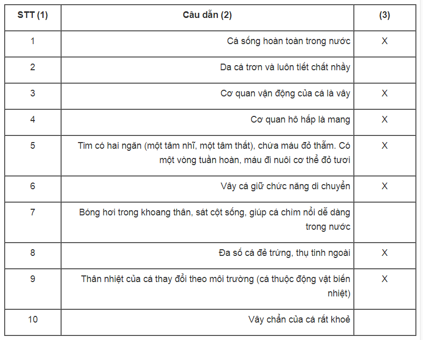Bài 15 trang 67 SBT Sinh học 7: Hãy đánh dấu X vào ô trống ở cột (3) phù hợp với nội dung ở cột (2) chỉ đặc điểm chung của lớp Cá trong bảng sau :