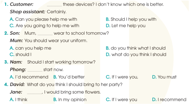 Bài 1 (trang 78 SBT Tiếng Anh 10 Global success): Complete the conversations by circling the best answers. Then practise reading them. (Hoàn thành các cuộc trò chuyện bằng cách khoanh tròn các câu trả lời hay nhất. Sau đó, thực hành đọc chúng.)
