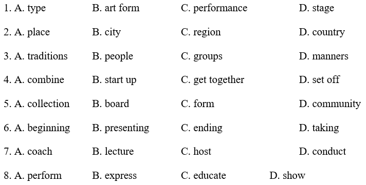Puppetry is an old (1) ___ in Southeast Asia, which is not just for children, but for audiences of all ages. Puppets in the (2) ___ vary in size and style, and their colourful designs are often crafted by the artists themselves. Puppet performances are also influenced by different (3) ____styles and skills. For example, performances in Malaysia and Thailand start with a battle while in Indonesia speech is very important. However, these differences didn't stop puppetry artists from ASEAN countries to (4) ____ and begin the ASEAN Puppets Exchange Programme in 2014. Despite the different cultures and languages, the programme has managed to develop a united yet diverse (5) ____ of ASEAN artists. Since 2014, there have been many workshops (6) ___ local puppet traditions. In addition, professional artists from one country have the opportunity to visit and (7) ___ community artists from another country, or work with other professional artists to create joint performances. They all come together because of their love of puppetry and telling stories through puppets. Their live puppet shows continue to entertain, (8) ____ and bond people in ASEAN.