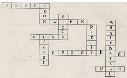 4. (trang 21 SBT Tiếng Anh 6): Write the following words into the boxes: door, schoolbag, ruler, clock, pencil, desk; waste basket; eraser, pen. (Viết các từ sau vào các ô: door, schoolbag, ruler, clock, pencil, desk; waste basket; eraser, pen)
