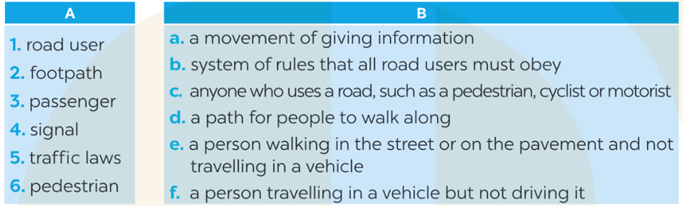 1 (trang 54 SBT Tiếng Anh 7 Global success): Match the words and phrases in column A with their definitions or explanations in column B (Nối các từ và cụm từ trong cột A với định nghĩa hoặc giải thích của chúng trong cột B)