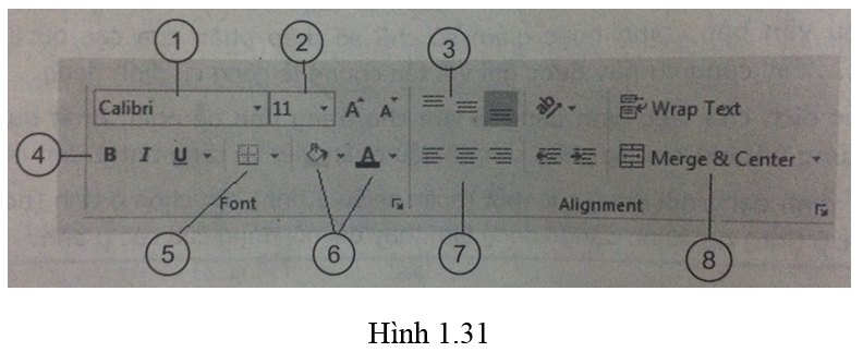 Bài 3 trang 38 SBT Tin học 7: Hãy điền tác dụng của một số lệnh trên dải lệnh Home của Excel (hình 1.31)