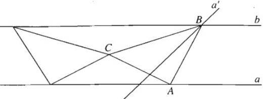 Xem B là ảnh của A qua phép đồng dạng có được bằng cách thực hiện liên tiếp phéo quay tâm C góc 45ο hoặc -45ο và phép vị tự tâm C tỉ số k = √2. Vì A thuộc a nên B thuộc đường thẳng a’ là ảnh của a qua phép đồng dạng nói trên. Vậy b là giao của a’ và b. Từ đó suy ra cách dựng . Bài toán có hai nghiệm hình.